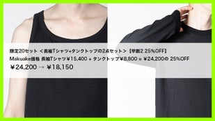 Makuake価格 長袖Tシャツ¥15,400 + タンクトップ¥8,800 = ¥24,200の 25%OFF