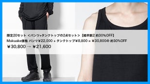 Makuake価格 パンツ¥22,000 + タンクトップ¥8,800 = ¥30,800の 約30%OFF