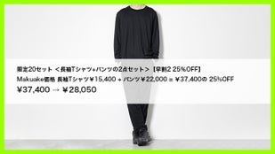 Makuake価格 長袖Tシャツ¥15,400 + パンツ¥22,000 = ¥37,400の 25%OFF