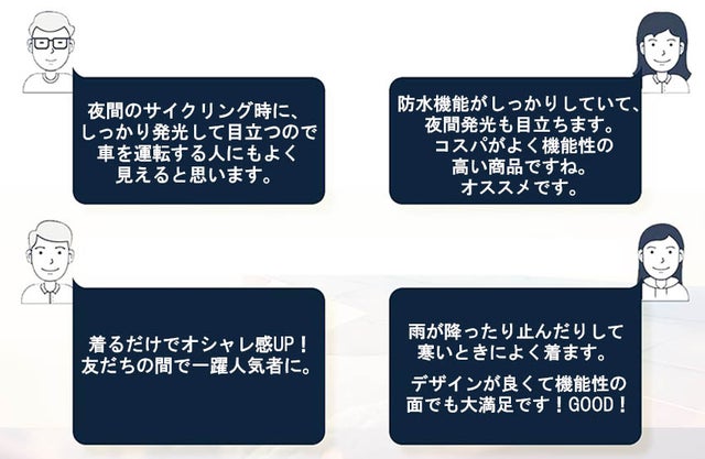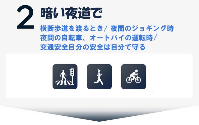 夜間のランニング時に、自転車やオートバイの運転時に、真夜中に横断歩道を渡る際や、夜間にお仕事される方にも役に立つジャケットです。