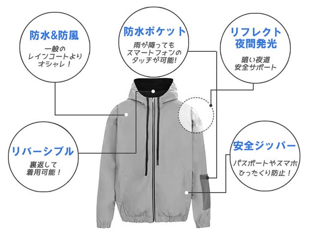 普段使いのときはフードジャケット ! 雨が降るときは防水ジャケット ! 夜には夜間発光まで!?