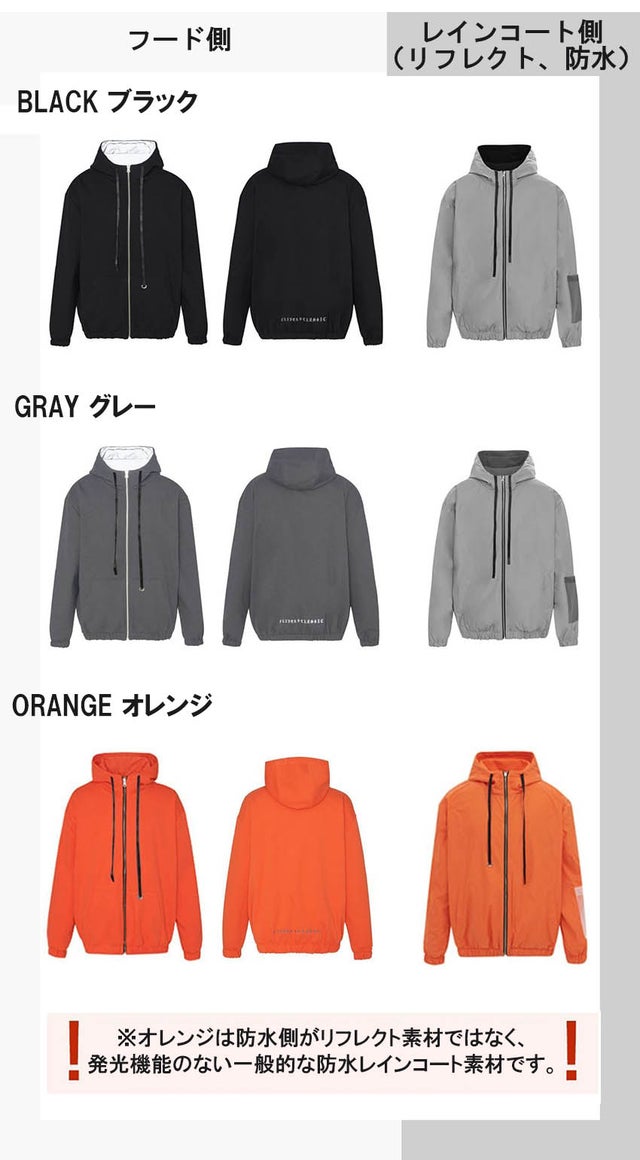 ※オレンジは防水側がリフレクト素材ではなく、発光機能のない一般的な防水レインコート素材です。