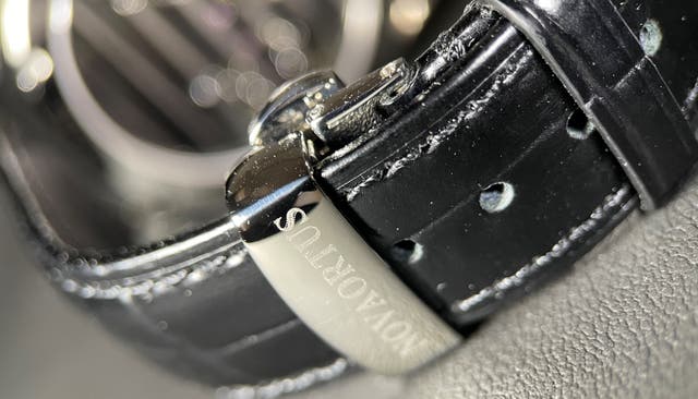 高級感を高める光沢感のある本革ベルト、面取りをして磨き上げ掴み心地を高めたクラウン。