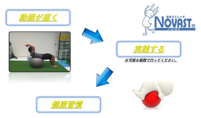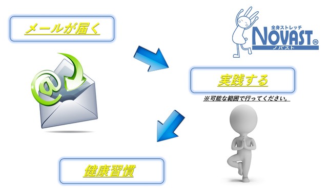 毎週1回健康に関するメルマガと動画の配信に加え、NOVASTストレッチ提供店舗での無料優待券(18回分、名古屋地区限定)をお送りいたします。