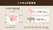 高タンパク:牛肉の約1.4倍 (100gあたりシカ肉23.9 g 牛肉17.1g)