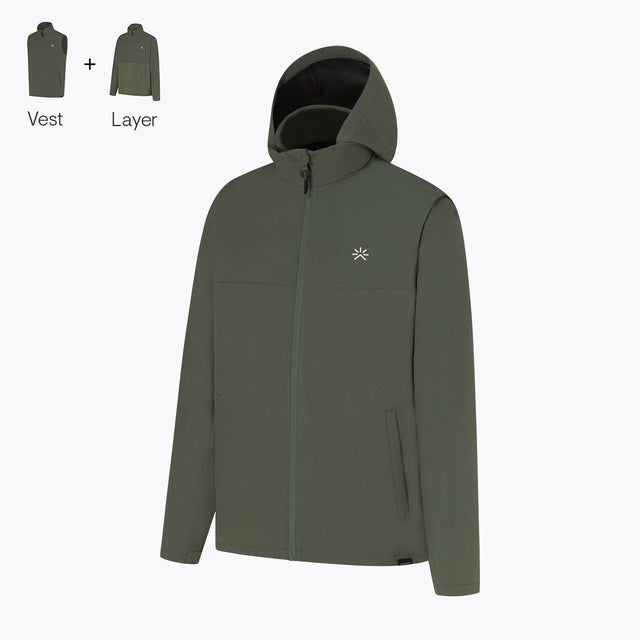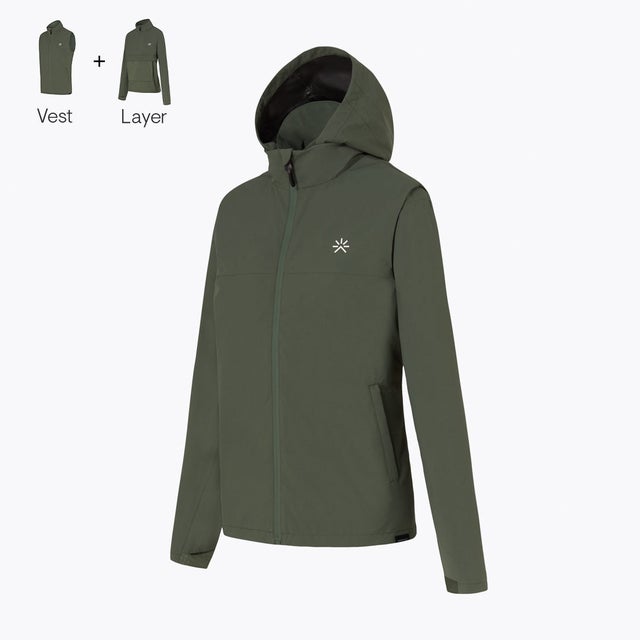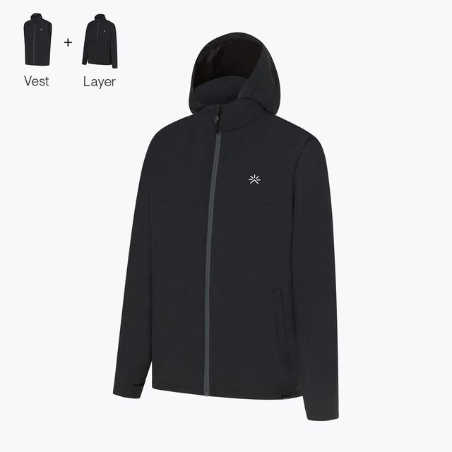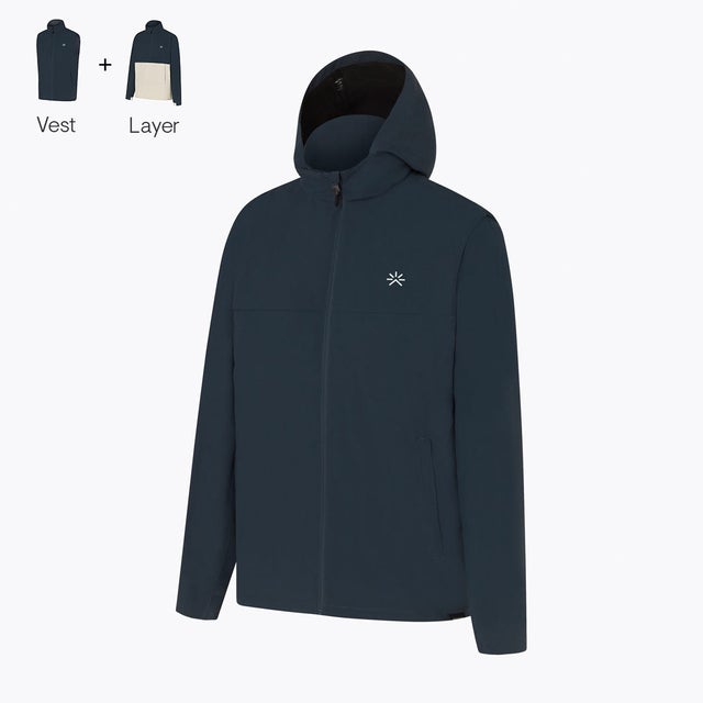 レインコートの保護、ウインドブレーカーのパフォーマンス、ジレの暖かさ、そしてシンプルなデザインでお洒落な見た目が特徴です。
