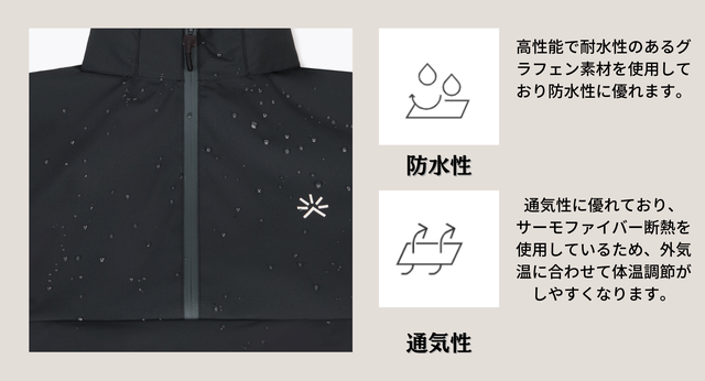 温度調整:リバーシブルベストに使用されている資材は、グラフェンテクノロジーで作られており、防水性と耐性があり環境からの熱を吸収して保持します。