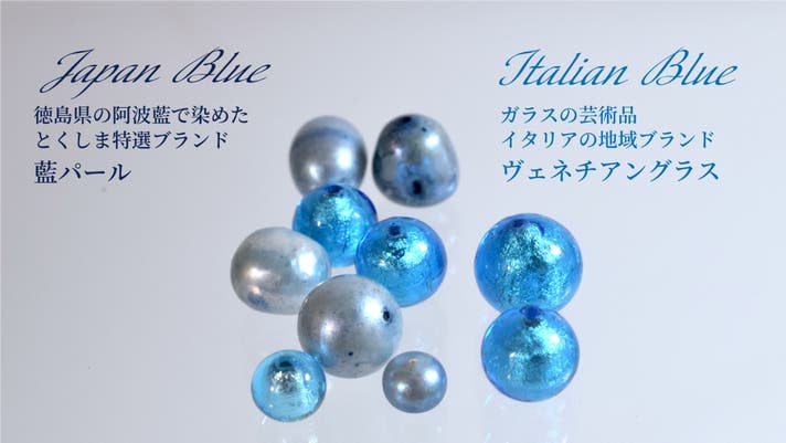 本プロジェクトは日本、イタリアそれぞれの伝統色「ブルー」をテーマに、阿波藍で藍染した“とくしま特選ブランド”の藍パール®と、イタリアの伝統産業のヴェネチアングラスのビーズを用いたアクセサリーをご紹介します。
