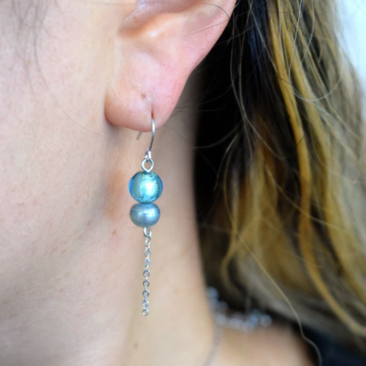8mmのヴェネチアングラスと6mm藍パール®を組みわせ、銀色のチェーンを下げた「揺れる」ピアスです。