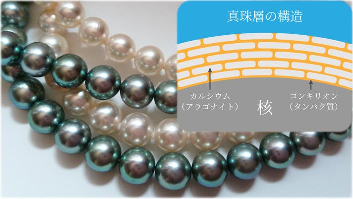 真珠は真珠層というカルシウムとコンキリオンというたんぱく質が結合し、幾重に重なった多層構造を持つ有機宝石です。天然真珠は生育の段階でこの隙間に不純物が入り、一粒ずつ色彩が異なります。