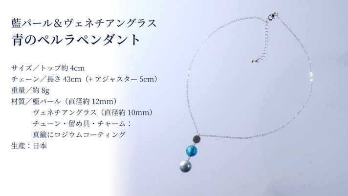 藍パール®は大粒の12mm、ヴェネチアングラスは10mmを使用しているので首元での存在感も抜群です。