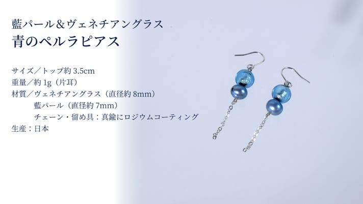 - 徳島県“とくしま特選ブランド”の藍パールと、イタリアのヴェネチアングラスのコラボアクセサリー。