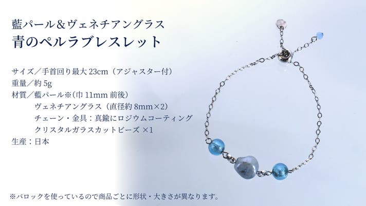 形が不揃いで同じものは一つと無いバロックの藍パール®※をメインに、8mmのヴェネチアングラスを左右に配したチェーンタイプのブレスレットです。