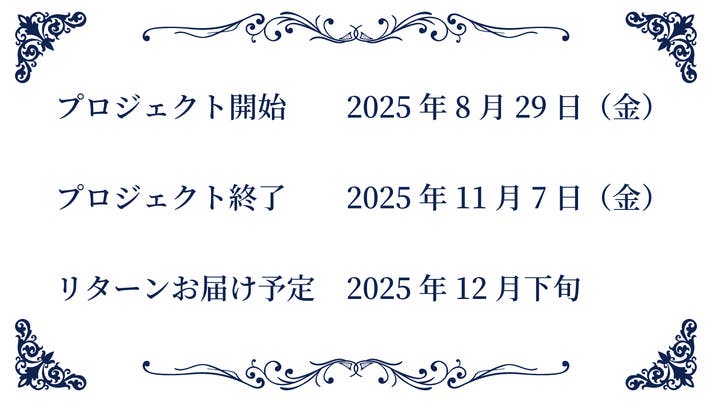 ※本文中に記載させていただいたスケジュールは、あくまでプロジェクト開始時点の予定です。応援購入の性質上、配送遅延の恐れがございます。