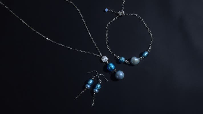 青のペルラペンダント/ピアス/ブレスレット各1点