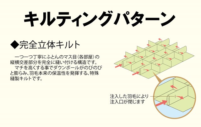 ●丸洗いしても中の羽毛がほとんどかたよることがなく、また数十回のクリーニングにも耐えることのできる羽毛布団用の特殊な「完全立体キルト」を使用します。