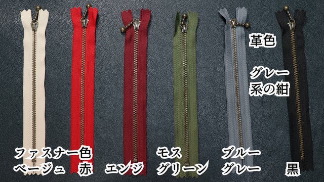 ・ファスナー色は、ベージュ、赤、エンジ、モスグリーン、ブルーグレー、黒からお選びください。