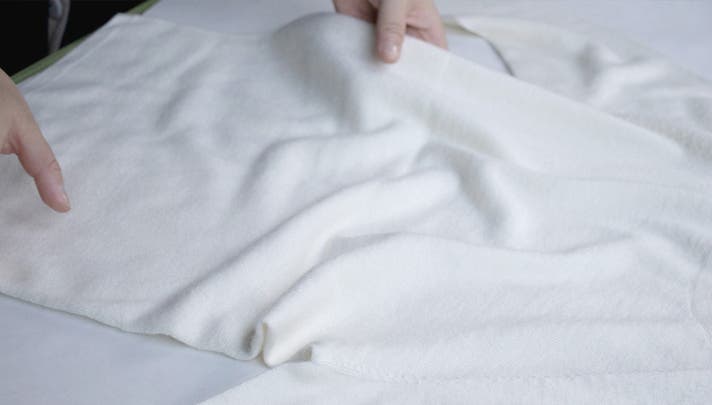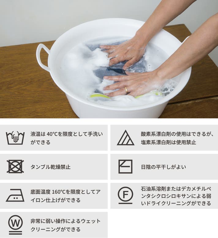 NUONEは、シルクに施した特殊加工によりご家庭で手洗いが可能です。裏返してネットに入れ、やさしく押し洗いしてください。