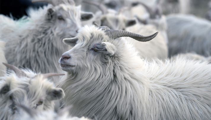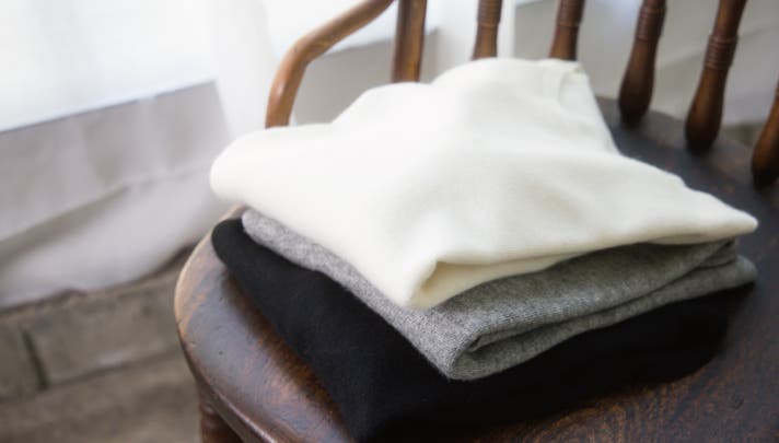 カシミヤは、カシミヤ山羊の柔らかな産毛を原料とした繊維で、細く均一で美しい光沢と、高い保温性・保湿性を持ちます。肌触りはなめらかで、チクチク感も少ないのが特徴です。