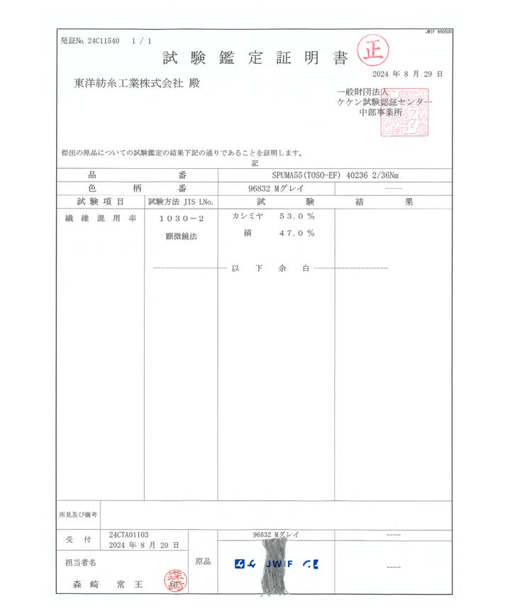東洋紡糸は、1879年に創立された日本の繊維産業発祥の工場「大阪府嶋下郡紡績社」を前身として約140年以上に渡って糸作りをしている紡績会社として、日本で最も紡績業の歴史を持っている会社の一つです。1930年にはカシミヤ糸の生産を国内で初めて行った会社でもあり、以来90年以上作り続けている純国産のカシミヤ糸は、その歴史と伝統を今日まで職人の手によって守り続けながら、世界に誇るレベルの品質で生産し続けています。