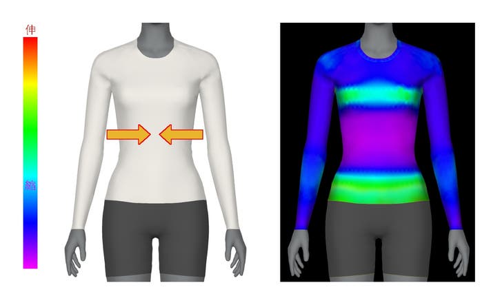 着用時のテンション表示を見るとウエスト部分がピンクになっています。ブルーがフラットな状態です。適度なハリのある編み目が、着たときのシルエットをより美しく見せ、ウエストがすっきりと引き締まるような着用感を得られます。
