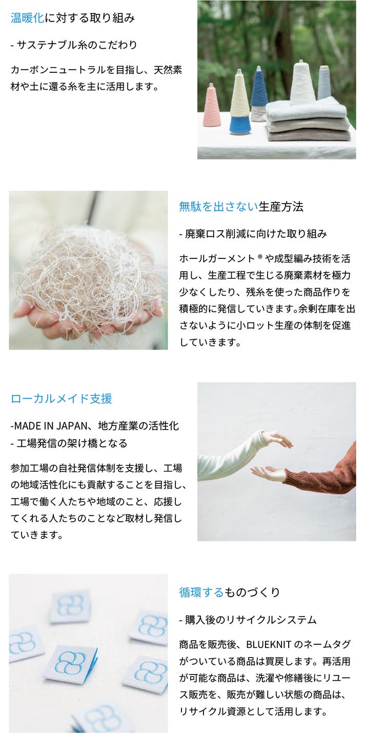 BLUEKNITは、地球環境に配慮し、心身に優しく、生産者を支え、エシカル社会を考える。これらの4つの観点をもとに“循環させる” ことに向き合うECモールとして立ち上がりました。