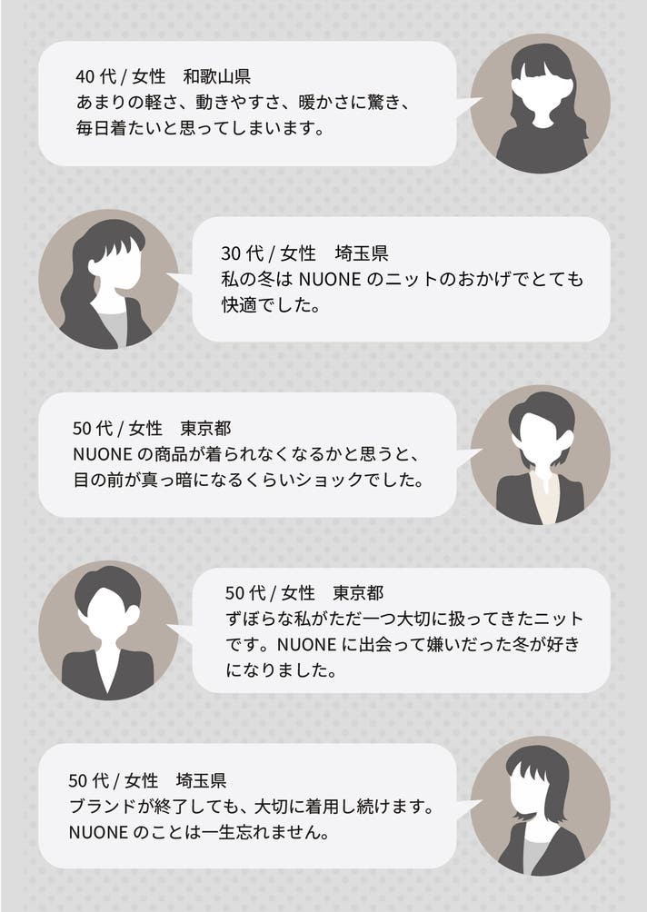 当初の目的であったホールガーメント®を世に広めるという役目を終えたと感じ、惜しまれながらも2019年にNUONEの幕は閉じましたが、ブランド終了後も復活を望むお声をたくさんいただきました。
