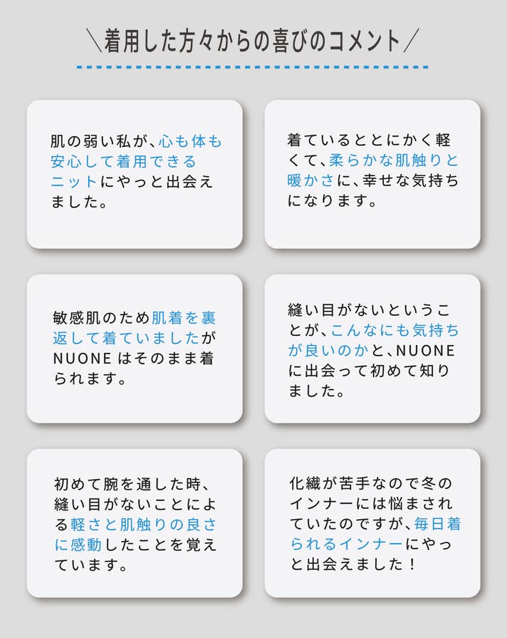 肌が敏感で縫いしろの刺激が負担になっていた方や、化繊の防寒インナーが苦手で困っていた方などから、寒い日も暖かくストレスなく着られたと、喜びの声をたくさんいただきました。