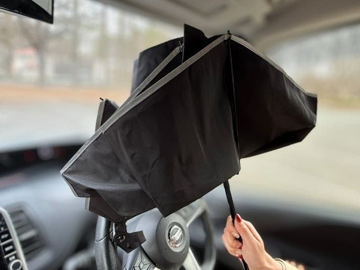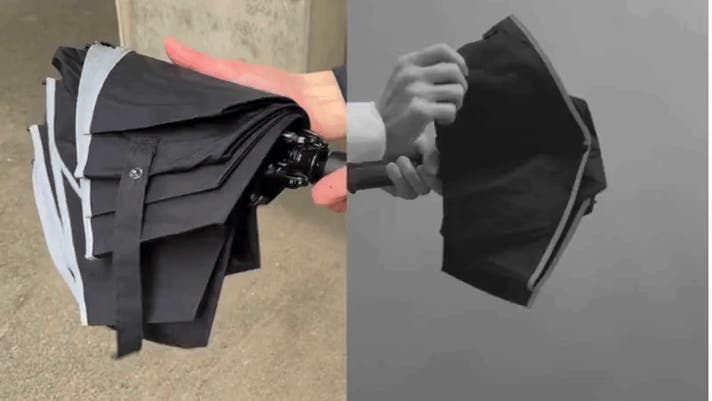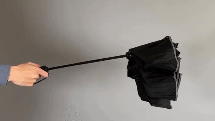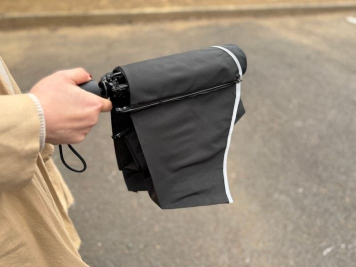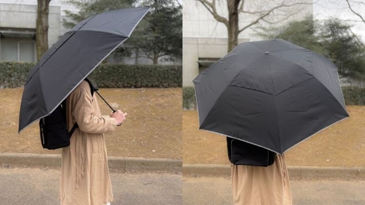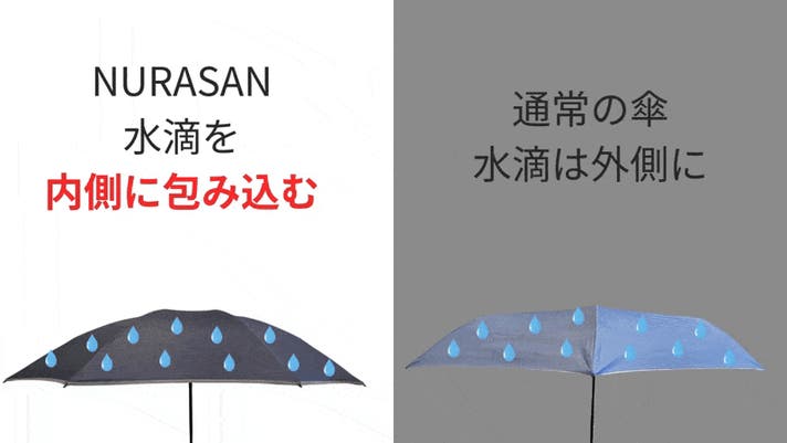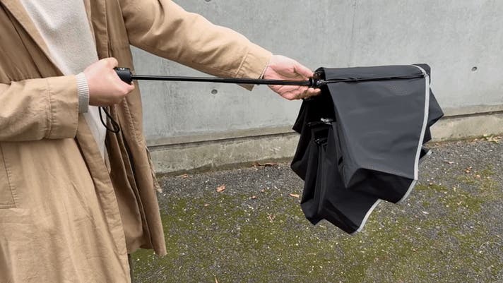 通常の傘とは逆の構造で、雨粒は内側に包み込まれます。