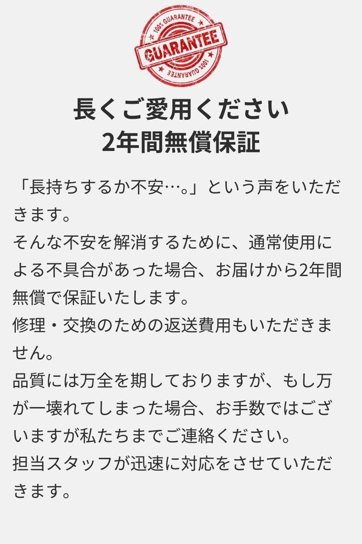 長くご愛用いただくため、通常使用における不具合は商品到着後2年間保証をおつけしています。詳しくは製品に付属されるご案内書をご確認ください。