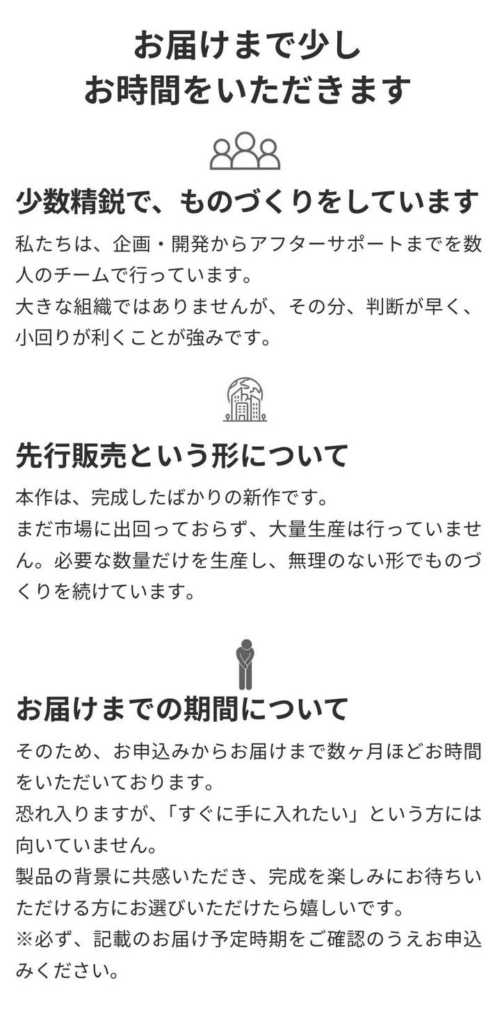・開発中の製品につきましては、デザイン・仕様が一部変更になる可能性もございます。 ・ご注文状況、使用部材の供給状況、製造工程上の都合等により出荷時期が遅れる場合があります。 ・他社様の類似品の販売を防ぐことができない可能性がある点、ご了承願います。 ・本プロジェクトを通して想定を上回る皆様から応援購入を頂き、現在進めている環境から量産体制を更に整えることができた場合、正規販売価格が販売予定価格より下がる可能性もございます。 ・本文中に記載させていただいたスケジュールは、あくまでプロジェクト公開時点の予定です。 応援購入の性質上、配送遅延のおそれがございます。 ・原則として、配送遅延に伴う応援購入のキャンセルはできませんが、リターン配送予定月から3ヶ月を超えた場合には、希望者に限りキャンセルにて対応させていただきます。 ・本プロジェクトはアンコールプロジェクト(*)の実施可能性があります。 (*)アンコールプロジェクトとは、実施したプロジェクトが好評だった場合において、当該プロジェクトが終了後に再び数週間から数ヶ月程度実施するプロジェクトを言います。 アンコールプロジェクト実施の場合、本プロジェクトとアンコールプロジェクトで同じ配送月を設定する可能性もございますが、本プロジェクトのサポーターを優先して配送いたします。 ・一部国内に類似商品が出回っている場合がございます。弊社では他社類似品に関してのお問い合わせには対応できませんのでご了承下さい。 Makuakeの性質上、以上の注意点につきまして、あらかじめご理解とご了承いただいた上で応援購入くださいますようよろしくお願い申し上げます。 ------------- <プロジェクトに関する情報> ・プロジェクトの属性 :OEM商品(オリジナル商品) ・プロジェクト実行者(国):日本 ・企画者(国):日本 ・製造者(国):中国 ------------- 【商品の不具合による返品・交換について】 1. 商品お届けから30日間の満足保証がございます。 ◾️対応条件: 商品の初期不良、または商品にご満足いただけない場合、到着後30日以内に製品同封のご案内カードよりLINEもしくはメールよりご連絡ください。 状況を確認の上、返金対応をさせていただきます。 ◾️返金額: リターン金額(税込)の全額 ◾️返品送料: 実行者負担 【返品をお受けできない商品】 ・事前にご連絡をいただいていない商品 ・商品到着後、31日以上経過した商品 2. 商品お届けから2年間の製品保証がございます。 ◾️対応条件: 商品の初期不良、通常使用による不具合があった場合、到着後2年間は無償で保証いたします。製品同封のご案内カードよりLINEもしくはメールよりご連絡ください。 状況を確認の上、修理、交換対応をさせていただきます。 ◾️返品送料/再送料: 実行者負担 【交換をお受けできない商品】 ・事前にご連絡をいただいていない商品 ・商品到着後、2年以上経過した商品 【交換をお受けできないケース】 ・限定品や同一商品の在庫がない場合など、代替品をご用意できない商品