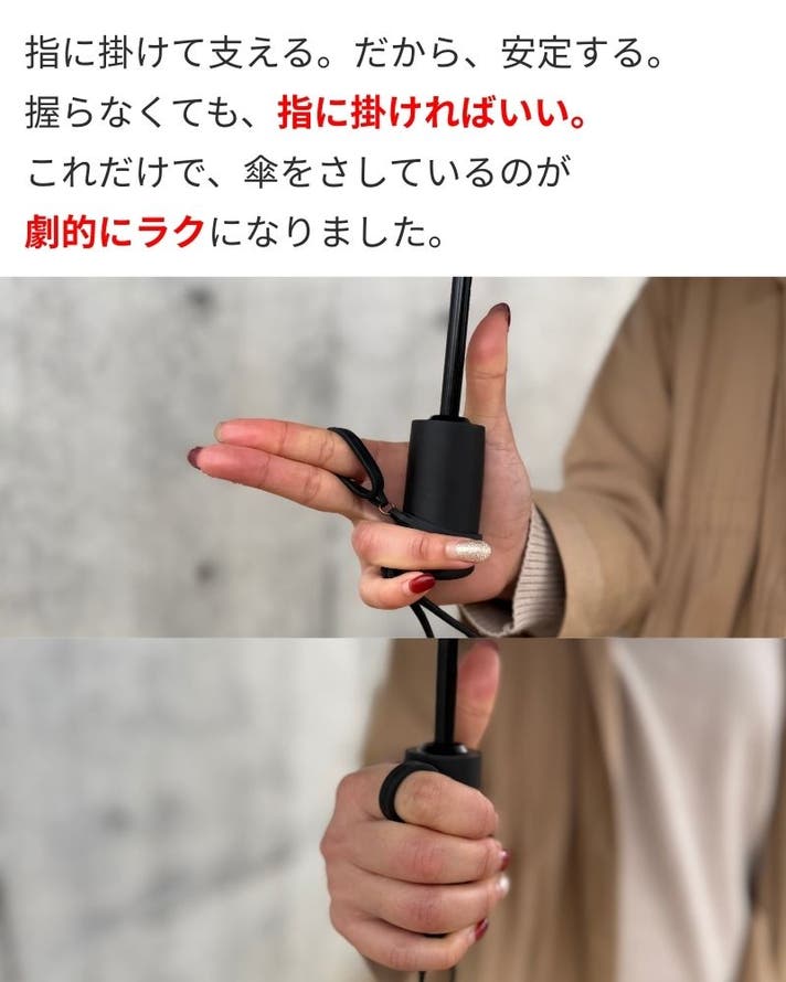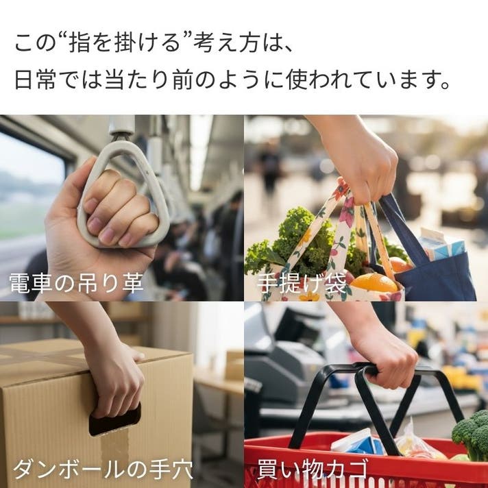 - 【握らない】指で支える新設計。荷物を持ったまま、片手で簡単に扱える