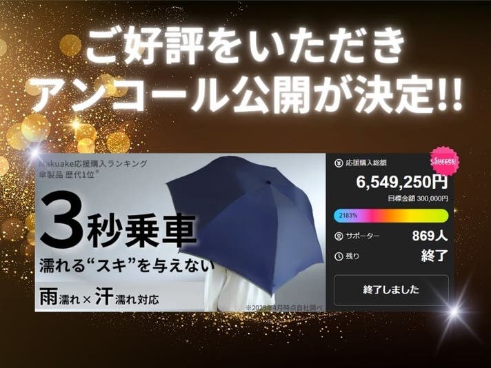 「Makuake(マクアケ)」は、実行者の想いを応援購入によって実現するアタラシイものやサービスのプラットフォームです。このページは、 ファッションカテゴリの 「【アンコール】濡れるスキを与えない。雨でも汗でも濡らさない傘で365日通勤が快適」プロジェクト詳細ページです。