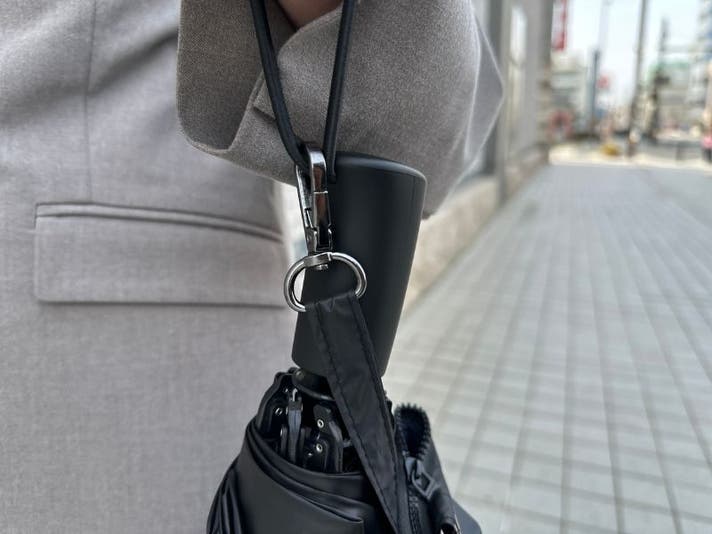 傘カバー側にフックがついているので、フックでかけたり、ストラップに巻き付けて持ち運ぶことも可能です。