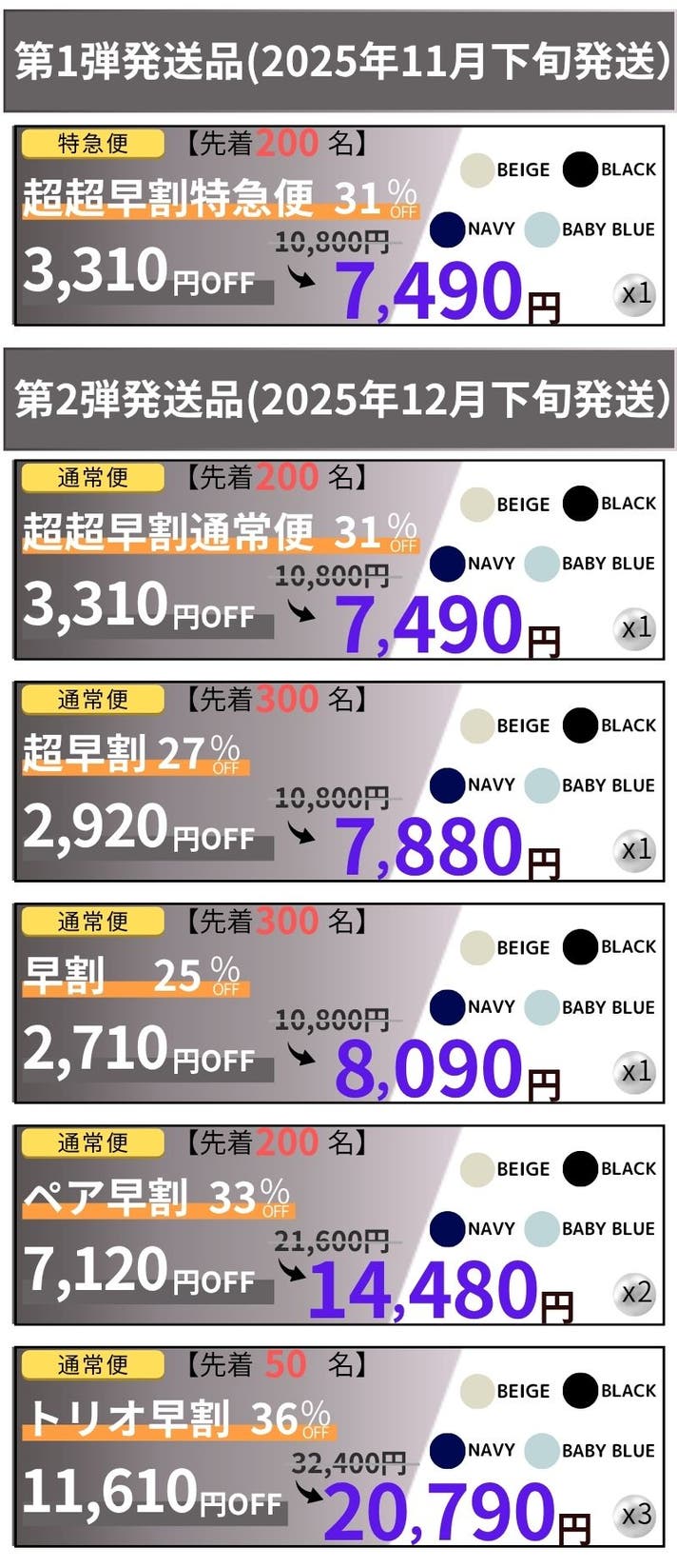 ・開発中の製品につきましては、デザイン・仕様が一部変更になる可能性もございます。 ・ご注文状況、使用部材の供給状況、製造工程上の都合等により出荷時期が遅れる場合があります。 ・他社様の類似品の販売を防ぐことができない可能性がある点、ご了承願います。 ・本プロジェクトを通して想定を上回る皆様から応援購入を頂き、現在進めている環境から量産体制を更に整えることができた場合、正規販売価格が販売予定価格より下がる可能性もございます。 ・本文中に記載させていただいたスケジュールは、あくまでプロジェクト公開時点の予定です。 応援購入の性質上、配送遅延のおそれがございます。 ・原則として、配送遅延に伴う応援購入のキャンセルはできませんが、 リターン配送予定月から3ヶ月を超えた場合には、希望者に限りキャンセルにて対応させていただきます。 ・本プロジェクトはアンコールプロジェクト(*)の実施可能性があります。 (*)アンコールプロジェクトとは、実施したプロジェクトが好評だった場合において、当該プロジェクトが終了後に再び数週間から数ヶ月程度実施するプロジェクトを言います。 アンコールプロジェクト実施の場合、本プロジェクトとアンコールプロジェクトで同じ配送月を設定する可能性もございますが、本プロジェクトのサポーターを優先して配送いたします。 ・一部国内に類似商品が出回っている場合がございます。弊社では他社類似品に関してのお問い合わせには対応できませんのでご了承下さい。 【商品の不具合による返品・交換について】 1. 商品お届けから30日間の満足保証がございます。 ◾️対応条件: 商品の初期不良、または商品にご満足いただけない場合、到着後30日以内に製品同封のご案内カードよりLINEもしくはメールよりご連絡ください。 状況を確認の上、返金対応をさせていただきます。 ◾️返金額: リターン金額(税込)の全額 ◾️返品送料: 実行者負担 【返品をお受けできない商品】 ・事前にご連絡をいただいていない商品 ・商品到着後、31日以上経過した商品 2. 商品お届けから2年間の製品保証がございます。 ◾️対応条件: 商品の初期不良、通常使用による不具合があった場合、到着後2年間は2年間無償で保証いたします。製品同封のご案内カードよりLINEもしくはメールよりご連絡ください。 状況を確認の上、修理、交換対応をさせていただきます。 ◾️返品送料/再送料: 実行者負担 【交換をお受けできない商品】 ・事前にご連絡をいただいていない商品 ・商品到着後、2年以上経過した商品 【交換をお受けできないケース】 ・限定品や同一商品の在庫がない場合など、代替品をご用意できない商品 Makuakeの性質上、以上の注意点につきまして、あらかじめご理解とご了承いただいた上で応援購入くださいますようよろしくお願い申し上げます。 <プロジェクトに関する情報> ・プロジェクトの属性 :OEM商品(オリジナル商品) ・プロジェクト実行者(国):日本 ・企画者(国):日本 ・製造者(国):中国