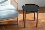 昔からある「漆塗りのお盆」を天板として用いながら、家具としての使いやすさと安定感を備えたモダンなサイドテーブルです。
