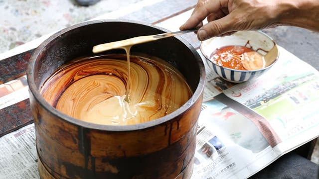 6月上旬~11月に掻子(かきこ)と呼ばれる職人さんが樹液を採取し、精製します。そして生漆(きうるし)が出来上がります。この1桶で数十万円以上します。