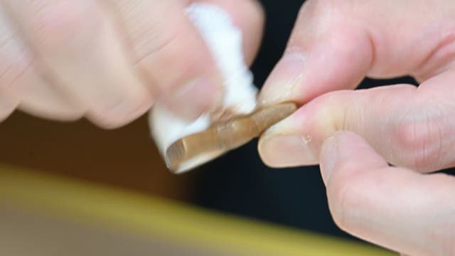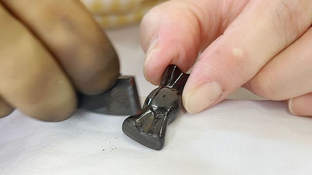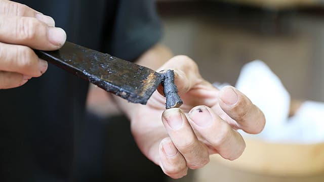 さらに水をつけながら砥石より柔らかく、キメの細かい炭で研ぎ、布で拭き取ります。