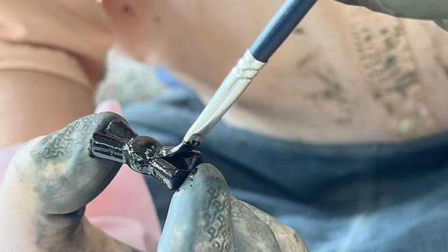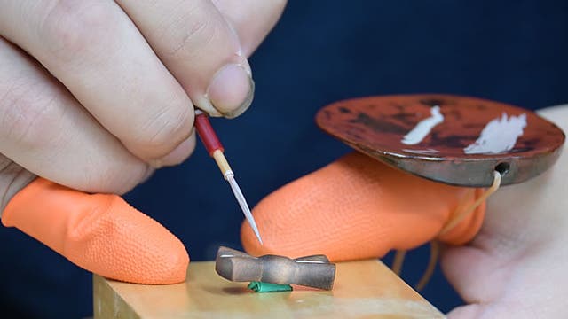 輪島塗の加飾技法の蒔絵(まきえ)。ねずみの毛でつくられた蒔絵筆を使い、ベンガラ漆で下絵を描き、金紛を蒔きつけます。リボンラペルピンとブローチでは蒔絵でイニシャルや模様を描きます。