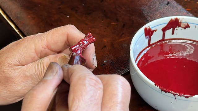 伝統色のひとつ「うるみ」:栗色に近い深みを帯びたこの赤色は、数種類の漆と顔料で作り出されます。