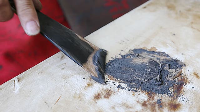 生漆(きうるし)を塗り、布で拭き取り、木の導管を塞ぎます。