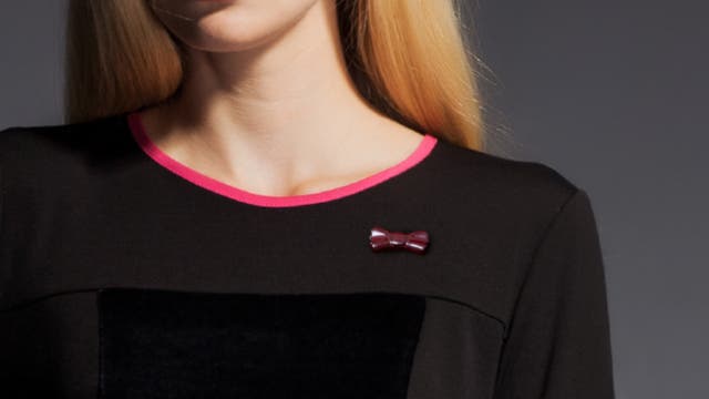第1段は、リボンをモチーフにしたラペルピンとブローチ。