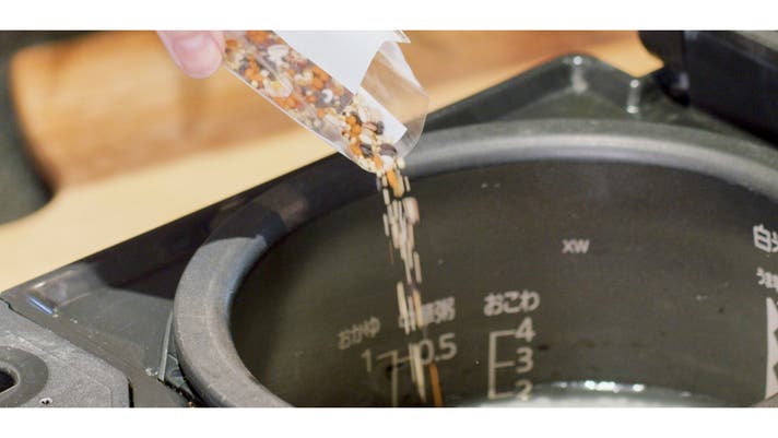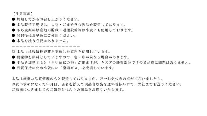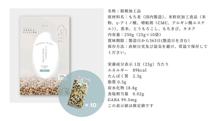 原材料名:もち麦(国内製造)、米粒状加工食品(米粉、γ-アミノ酸、増粘剤(CMC、アルギン酸エステル))、黒米、とうもろこし、もちきび、キヌア