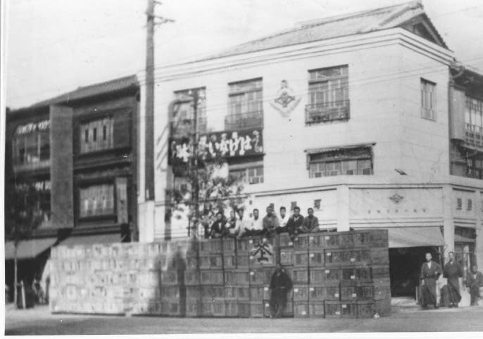 ▼昭和15年「鼻緒100ケース以上購入で車プレゼント」キャンペーンで購入者と記念撮影。