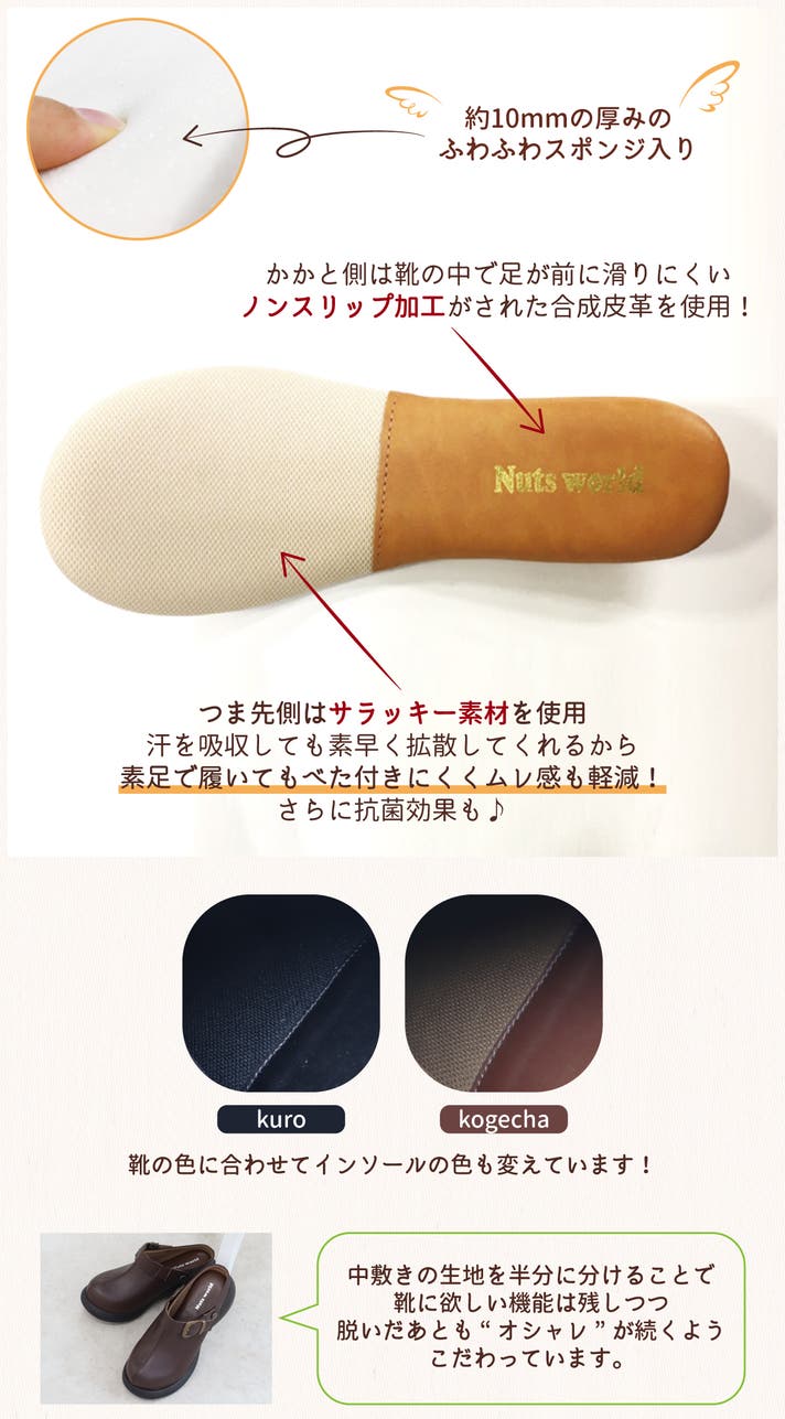 Nuts worldは、全体的にゆったりとしたつくりになっているため、甲高幅広でお悩みの方や、美容師さんなど立ち仕事の方からも「快適!」と好評です。