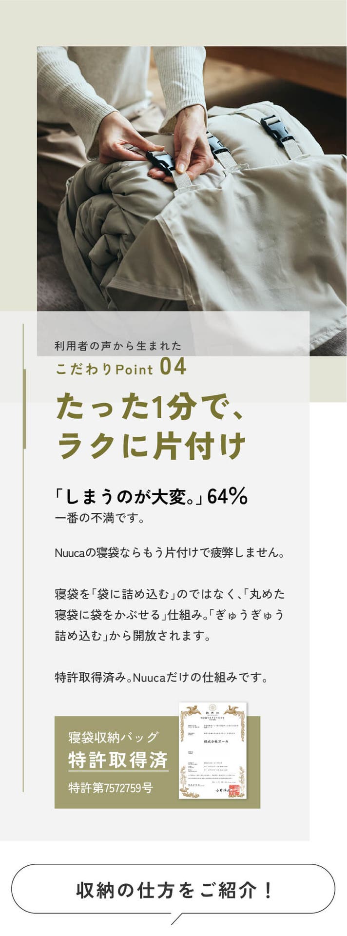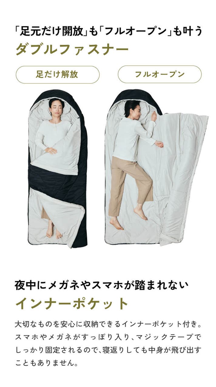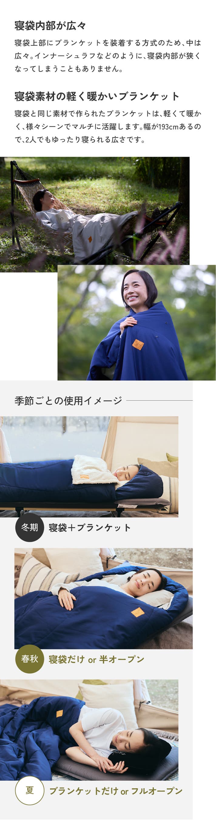 - 「冬用寝袋」「春秋用寝袋」「夏用ブランケット」の3通りで使える!しかも1分収納!