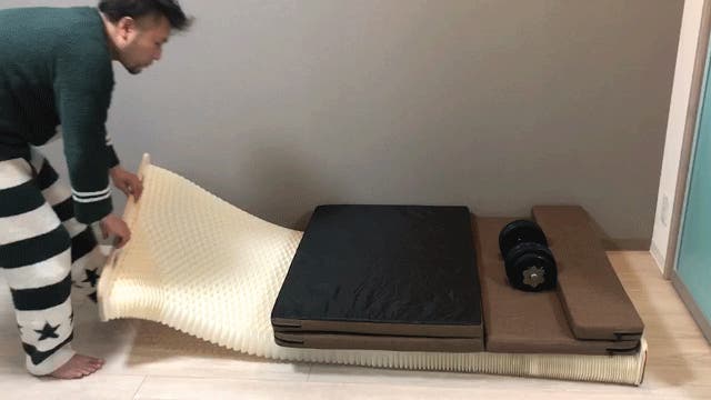 ③引き伸ばしたベッドの上に畳んだマットレスを置きます。