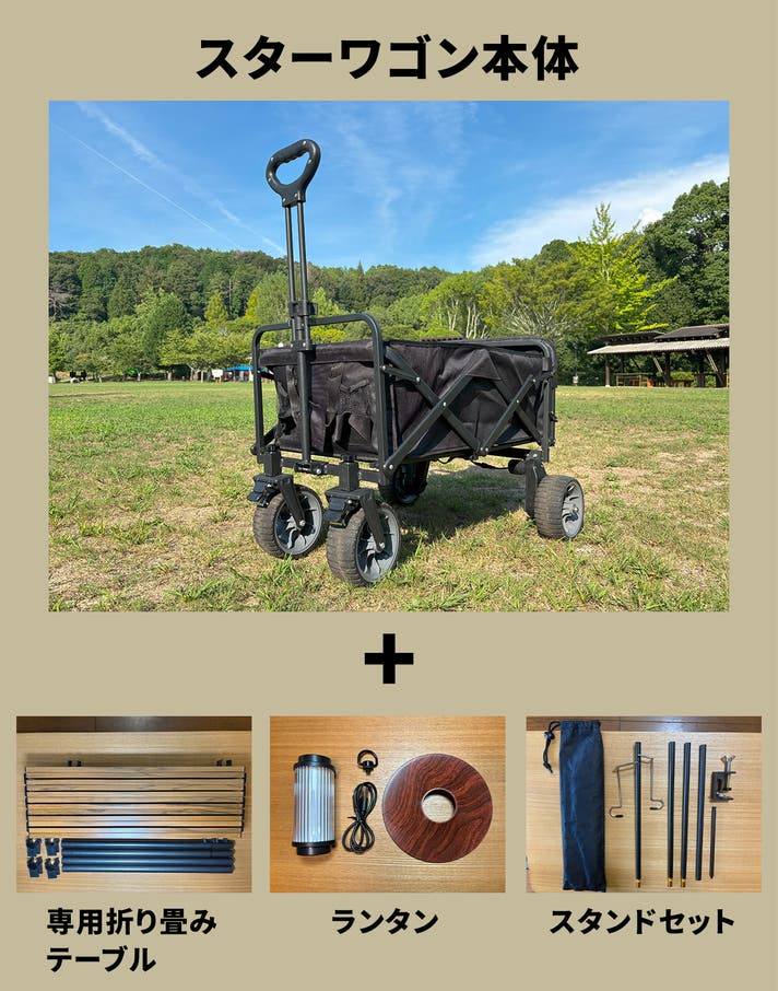 コンプリートセットはスターワゴンに【専用折り畳みテーブル】【ランタン&スタンドセット】が付いてくる大変お得なセットとなっております。