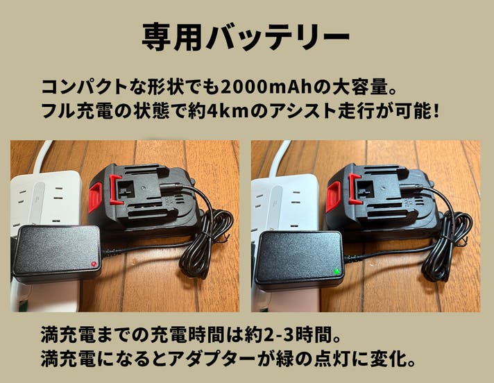 A:バッテリーがフル充電の状態で約4kmのアシスト走行が可能です。