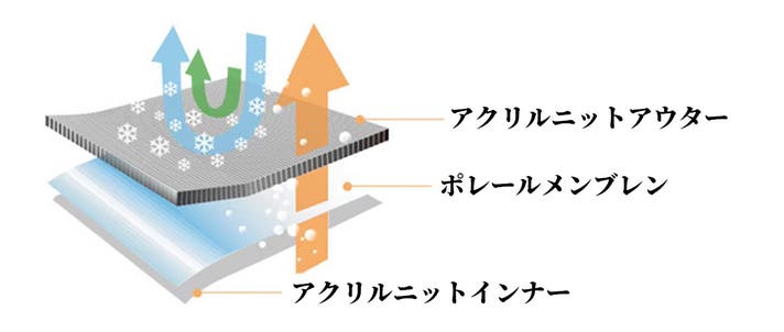 ※表面素材のニット自体は防水ではありませんので濡れます。ただし、中間層に防水素材のポレールメンブレンを使用しているため、内部まで水が浸透しにくい構造となっております。